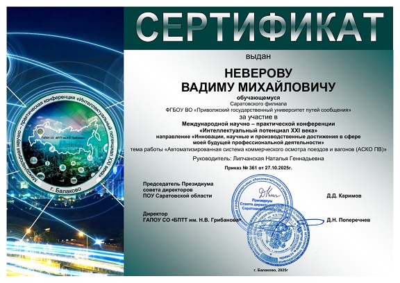 В конференции принял онлайн-участие студент 3 курса отделения «Организация перевозок и управление на транспорте» Неверов В. (гр.Д34) с вручением сертификата, научный руководитель Липчанская Н.Г.