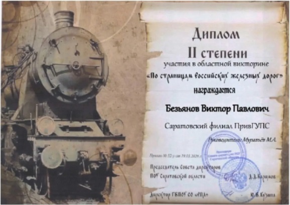 По итогам участия 25 марта 2026 года в областной викторине «По страницам Российских железных дорог» студент отделения ТЭПС группы Т-37 Безьянов Виктор занял 2 призовое место.