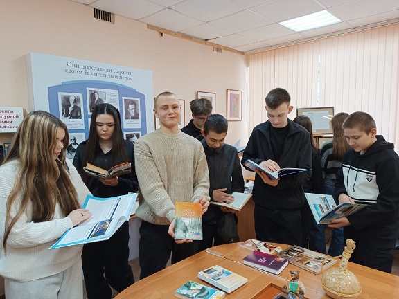 Затем состоялось знакомство с экспонатами литературного музея саратовских писателей прошлого и настоящего. Заведующая музеем Алсафова Алина Николаевна рассказала студентам о литературных премиях имени М.Алексеева и К.Федина.