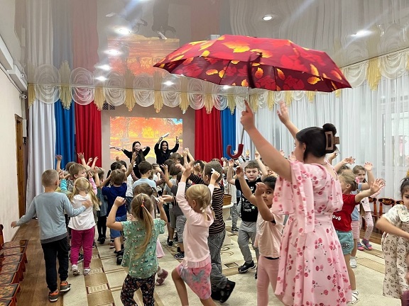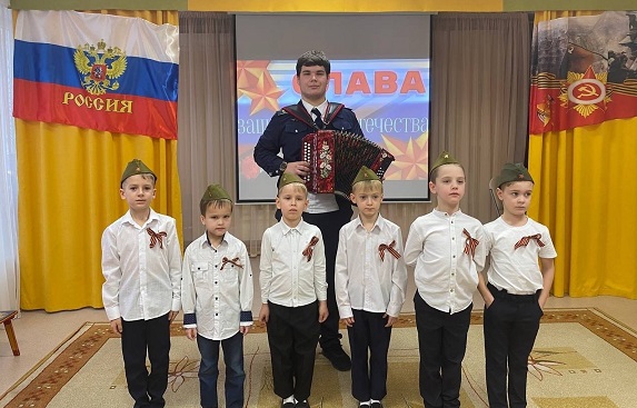 - совместное творчество (разминки и хороводы ''Паровозик" перед мероприятиями, костюмированные представления и музыкальные гостиные, где и старшие, и младшие под аккомпанемент баяна поют патриотические песни и песни из детских кинофильмов).