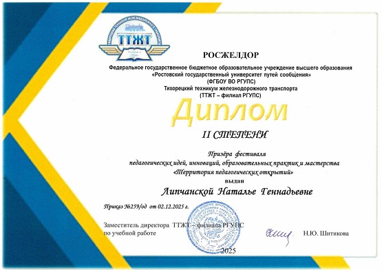 В номинации «Технологии будущего» Липчанской Н.Г. предоставлена работа «Нестандартное решение изучения дисциплины ТэиБД», за которую вручен Диплом II степени.